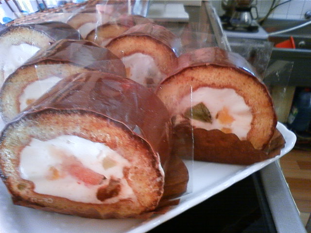 フルーツと生クリームのロールケーキで、まわりはガナッシュです。